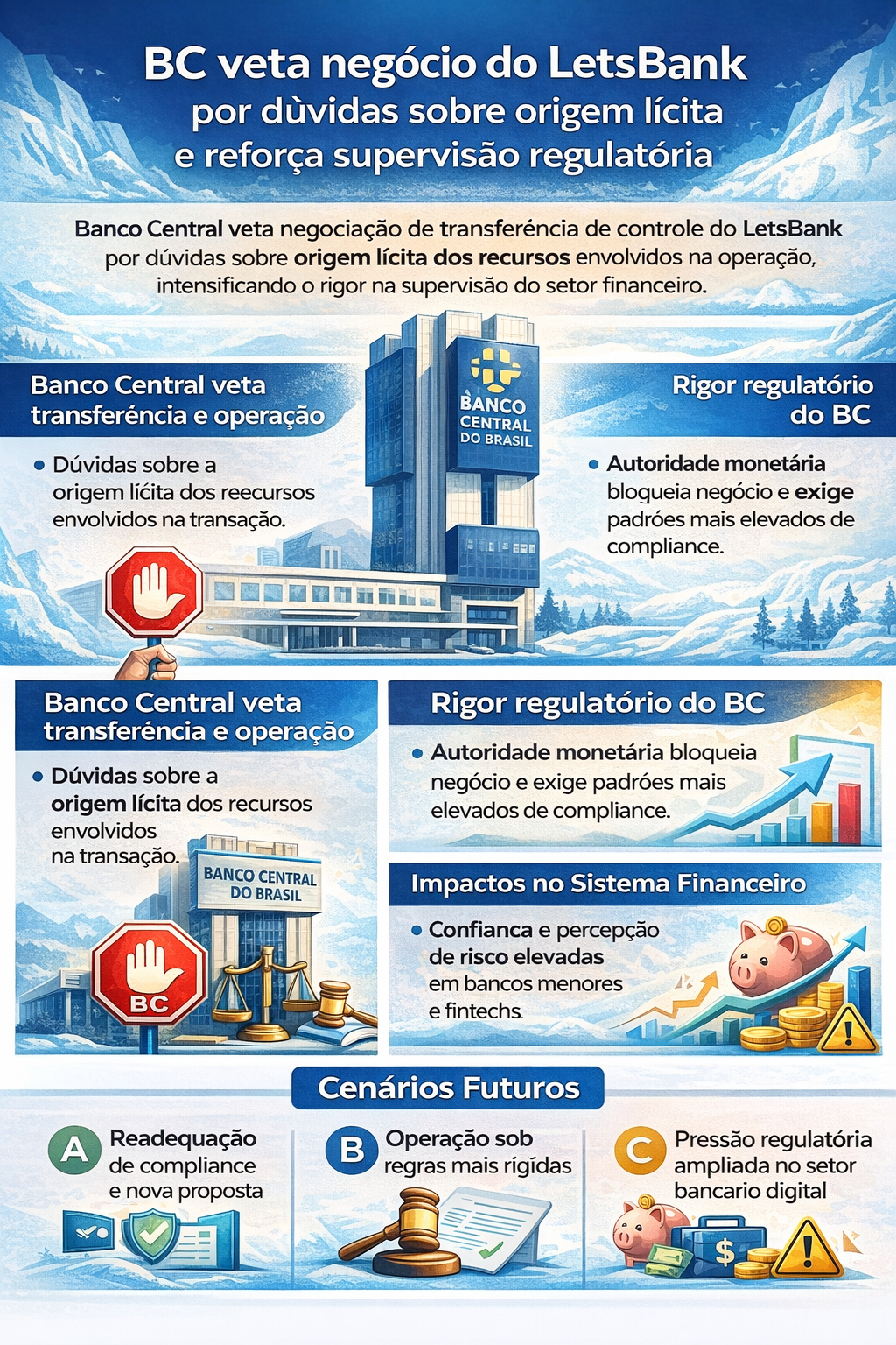 O Banco Central do Brasil (BC) vetou uma operação de transferência de controle e potencial negócio envolvendo o banco digital LetsBank (ligado ao grupo Master e ao Bluebank) devido a dúvidas sobre a origem lícita dos recursos envolvidos e adequação regulatória, interrompendo um processo que vinha sendo analisado como parte de uma reorganização societária mais ampla do banco e seus ativos. Esse veto reforça o papel do órgão regulador na supervisão prudencial do sistema financeiro e levanta questões sobre governança e gestão de riscos no setor bancário.