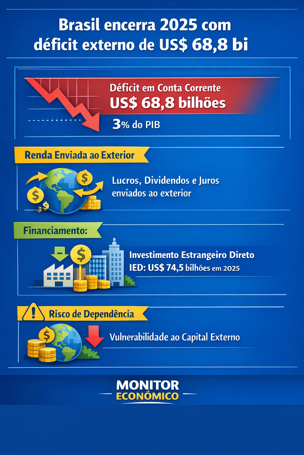 O Brasil encerrou o ano de 2025 com déficit de US$ 68,8 bilhões nas contas externas, segundo dados divulgados pelo Banco Central do Brasil. O resultado reflete o desequilíbrio entre o que o país paga e o que recebe do resto do mundo em comércio, serviços e rendas, e reforça pontos de atenção para 2026.