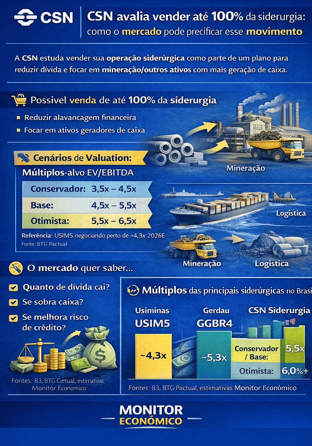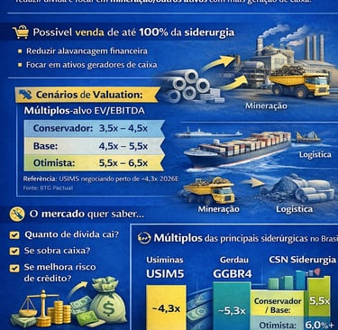 Relatório do BTG aponta a ação negociando perto de ~4,3x EV/EBITDA 2026 (e mostra EV/EBITDA 2026E na casa de ~4,9x em tabela). Isso dá uma pista do “piso” de múltiplo para siderurgia mais cíclica e com maior risco operacional.