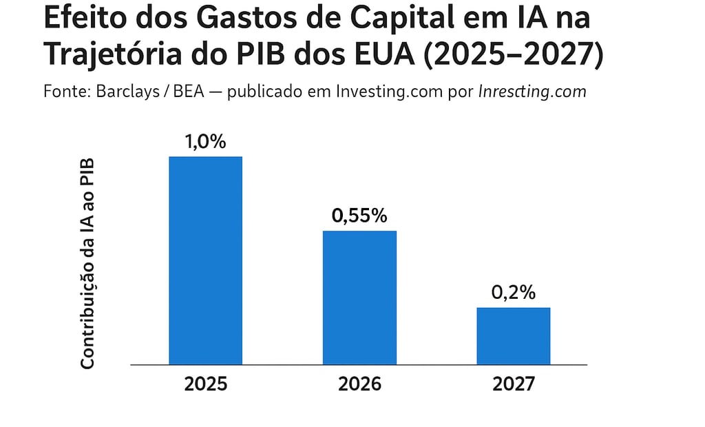 O Barclays estima que os gastos de capital em IA adicionaram cerca de +1,0 ponto percentual ao crescimento real do PIB no 1º semestre de 2025.