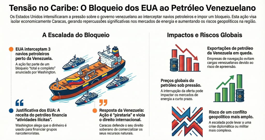Na semana passada, Trump anunciou um bloqueio “total e completo” a petroleiros sancionados que entram ou saem da Venezuela, medida que, na prática, visa isolar economicamente o governo do presidente Nicolás Maduro. Esse bloqueio integra uma estratégia mais ampla de pressão política e econômica, incluindo um colossal desdobramento naval no Caribe e sanções adicionais a navios e aliados venezuelanos.
