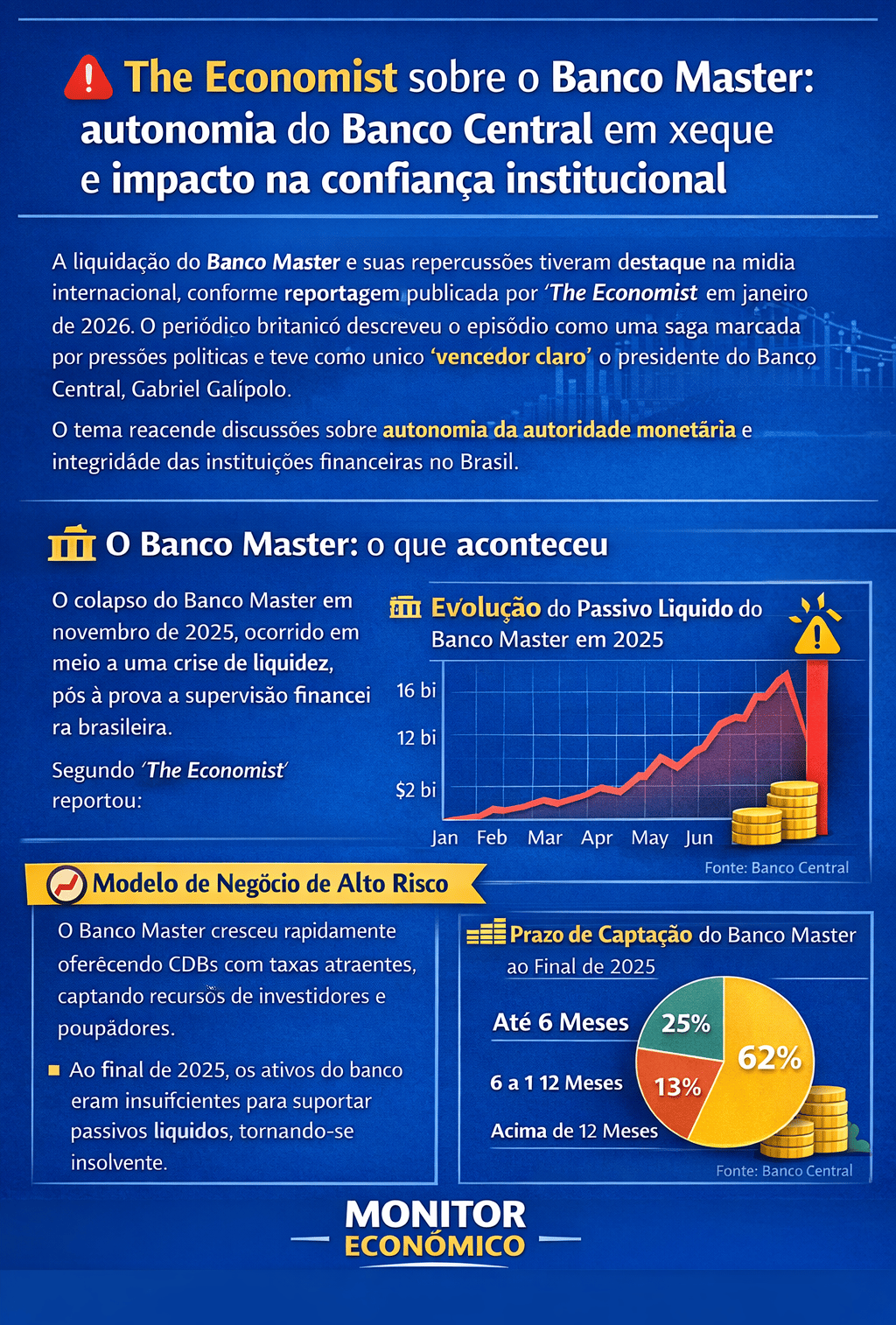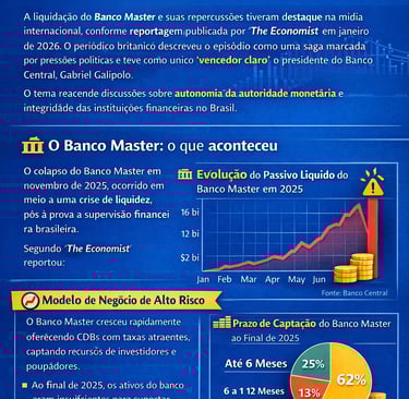 O The Economist publicou uma reportagem sobre o colapso do Banco Master e o papel do Banco Central do Brasil no processo de liquidação da instituição financeira, gerando repercussão internacional e levantando questões institucionais relevantes para o Brasil.