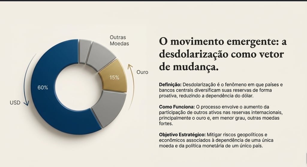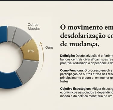 Essa relação está no cerne das discussões sobre desdolarização, um fenômeno em que países e bancos centrais diversificam suas reservas, reduzindo a dependência do dólar e aumentando a participação de ouro ou outras moedas nas reservas internacionais. Por que isso importa