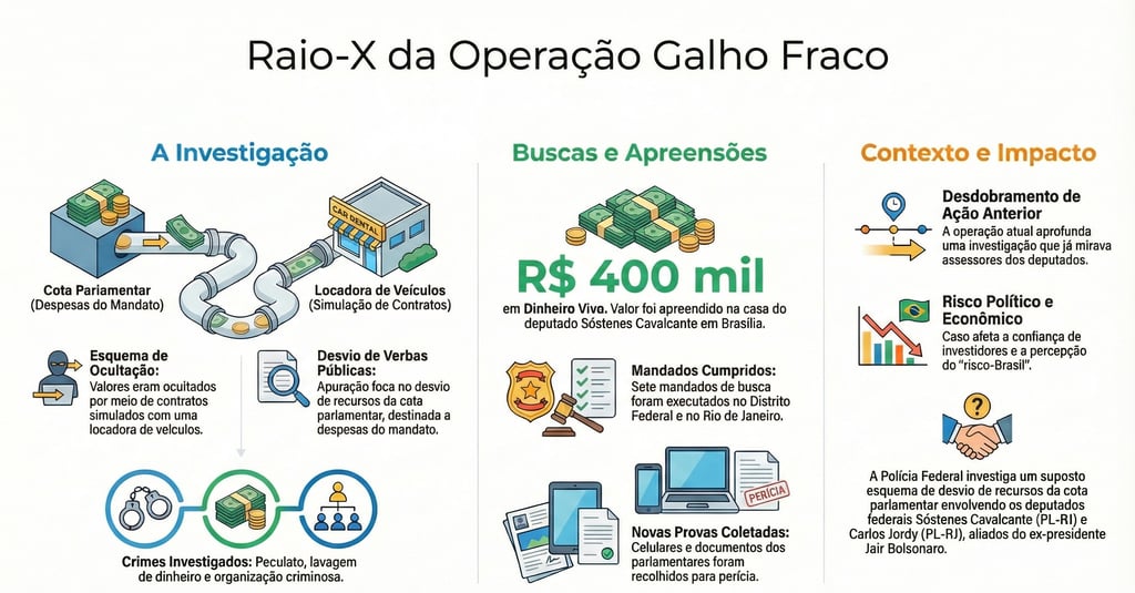 Durante as buscas, a PF teria apreendido aproximadamente R$ 400 mil em dinheiro vivo na casa do deputado Sóstenes Cavalcante em Brasília — material que agora integra a investigação e pode reforçar indícios de ocultação de valores públicos.