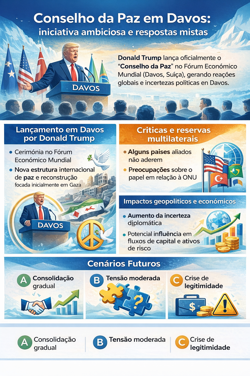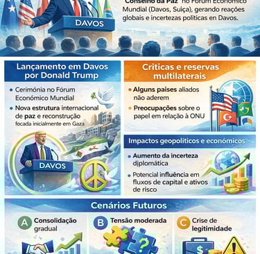 Enquanto Trump apresenta o Conselho como um mecanismo inovador de paz, sua eficácia e aceitação global ainda são incertas — o que cria ambiente de volatilidade diplomática e pode influenciar percepções de risco de investidores globais.